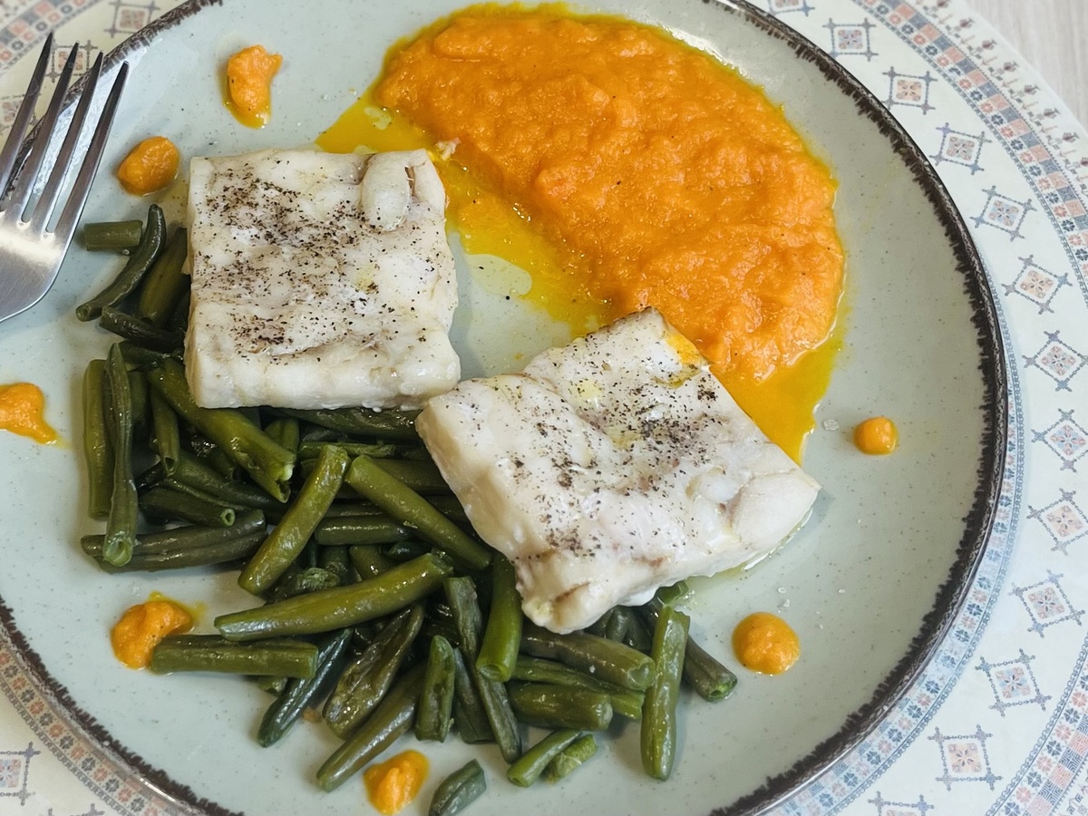 Минтай с обжаренной стручковой фасолью и морковным пюре