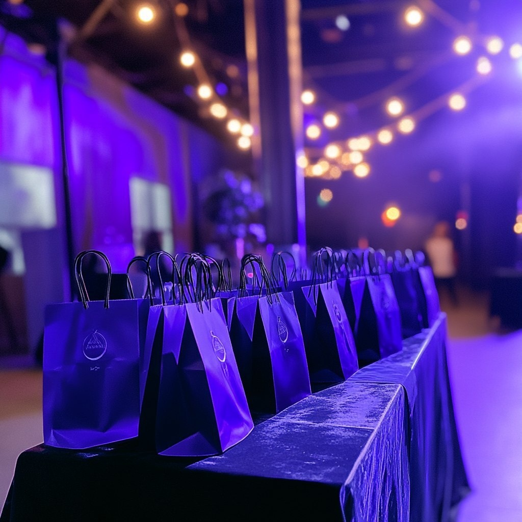 Создано на основе запроса: a table at a purple lit festival with plain deep blue gift bags on the table