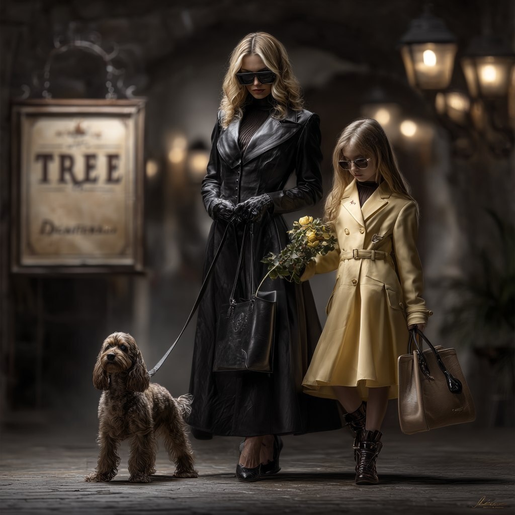Создано на основе запроса: A mysterious woman wearing long black leather gloves and sunglasses and holding flowers stands next to her daughter, dressed in a yellow skirt suit with dark shoes and a handbag, while the girl wears brown leather knee-high boots and holds the leash of an adorable dog. A sign on the wall of their home reads "TREE". The scene is illuminated by warm streetlights, creating a cinematic atmosphere. This detailed illustration captures every nuance of both women's appearance, from their facial features to the details.