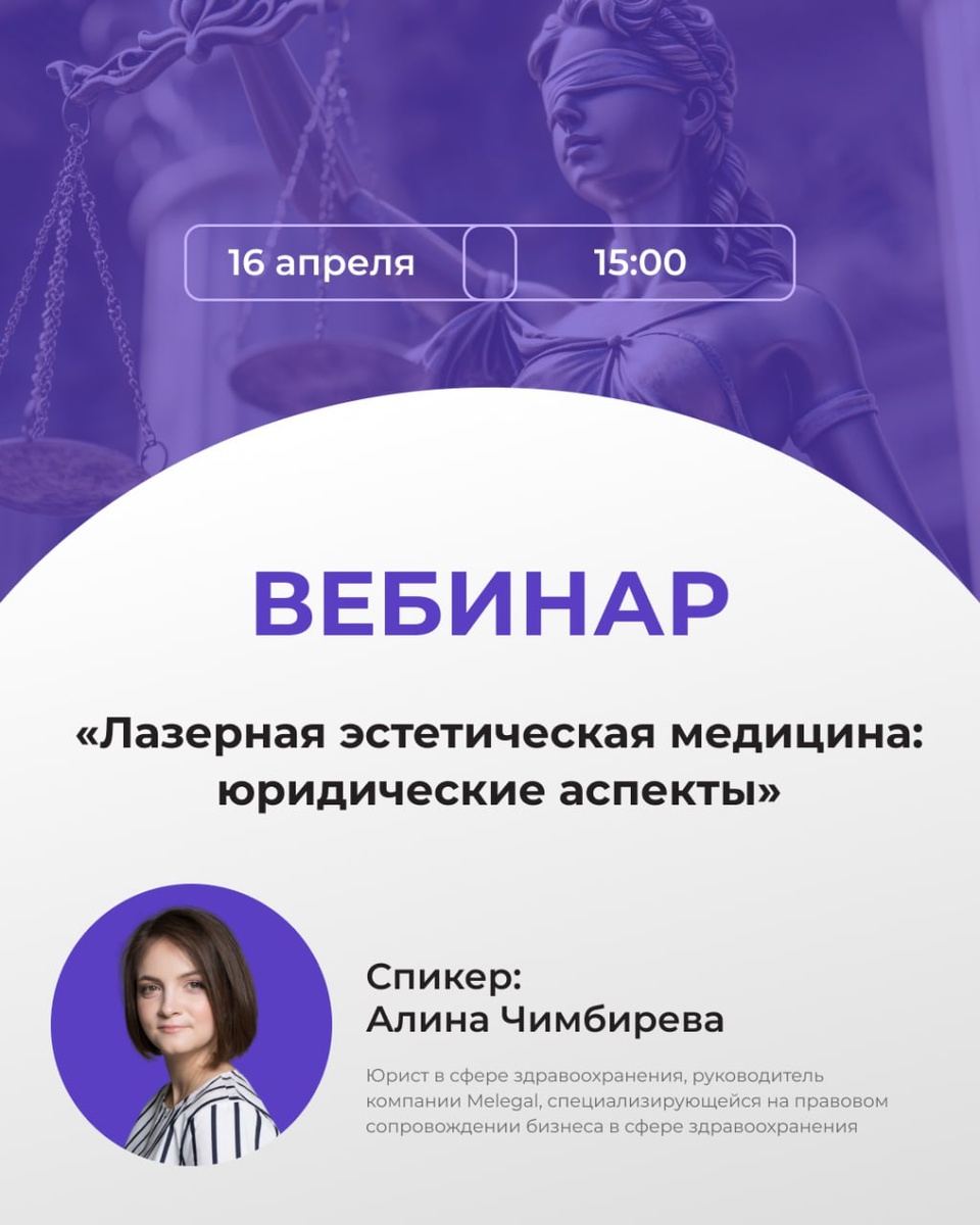 Дорогие коллеги, приглашаем вас на полезный вебинар который пройдет 16 апреля для руководителей клиник и специалистов эстетической медицины! Тема: «Лазерная эстетическая медицина: юридические аспекты» Спикер вебинара: Алина Андреевна Чимбирева — юрист в сфере здравоохранения, руководитель компании Melegal (правовое сопровождение бизнеса в медицине). Что будем разбирать? 📍Статус оборудования и лицензирование — какие требования нужно соблюдать? 📍Оформление отношений с пациентами — ИДС, карты, планы лечения: как защитить себя? 📍Внесение сведений в ЕГИСЗ — пора действовать или можно подождать? 📍Основные претензии пациентов после лазерных процедур — как решать конфликты? 📍Судебные споры с пациентами — какие риски ждут клиники и как их минимизировать? Дата: 16 апреля Время: 15:00 по московскому времени ЗАРЕГИСТРИРОВАТЬСЯ 🥳 8️⃣9️⃣5️⃣🥳