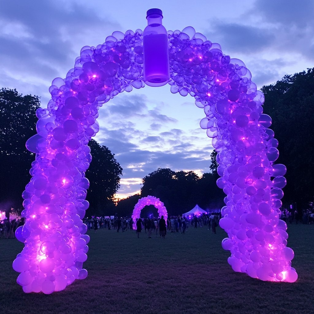 Создано на основе запроса: An archway at a festival in the shape of a serum bottle, the arch is made up of lilac plastic ballooon shapes