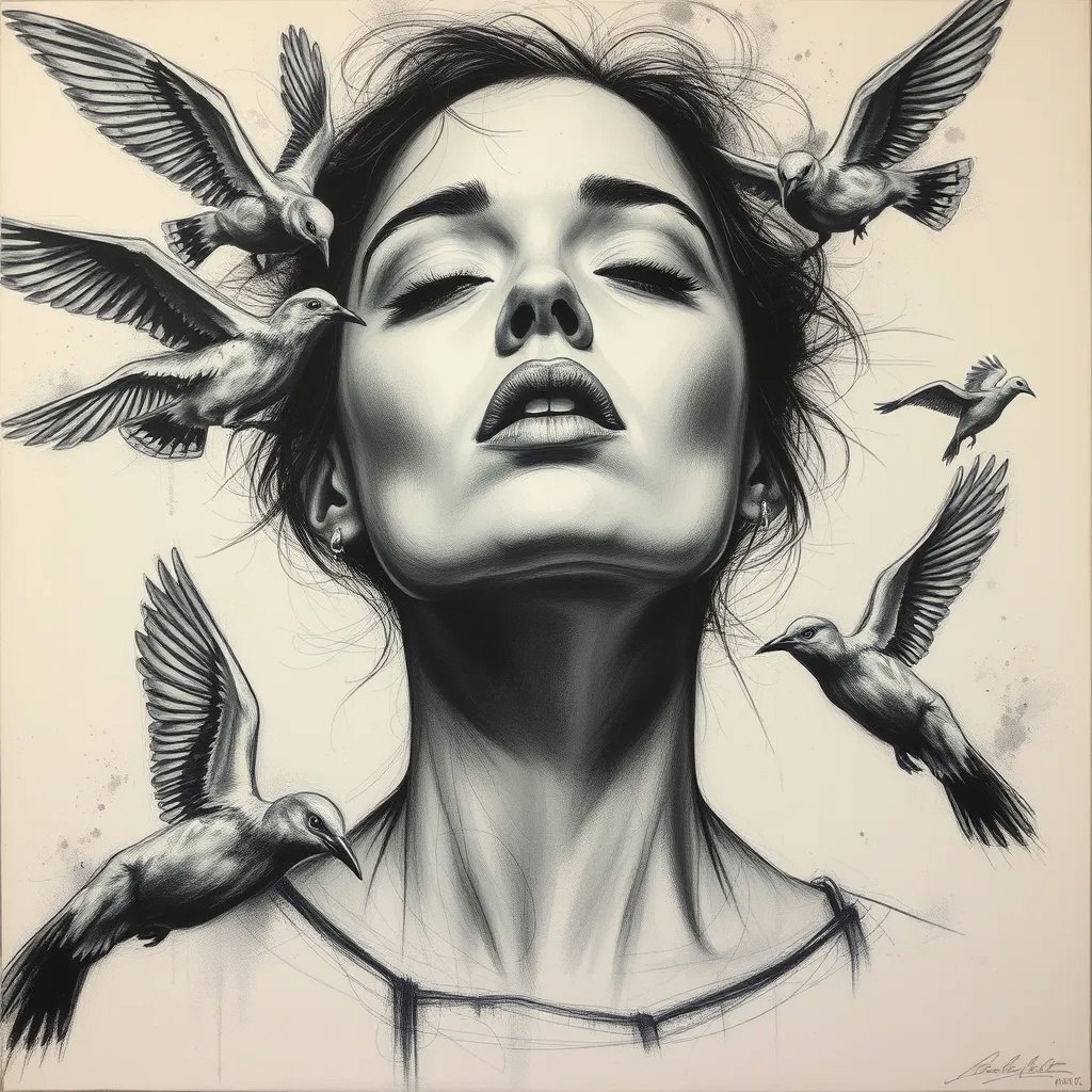 a drawing of a woman with birds flying around her, a charcoal drawing, by Tony Sart, tumblr, very detailed beautiful face, ryan hewett, 144x144 canvas, 8 k artistic lithography, hyperrealistic mixed media, trending on artstration, acrylic and spraypaint, highly realistic, saatchi art #neuroart #нейроарт #ai #ии #нейросеть #картинки #искусственныйинтеллект #цифровоеискусство #digitalart #арт #art #prompt #промпт #подсказка