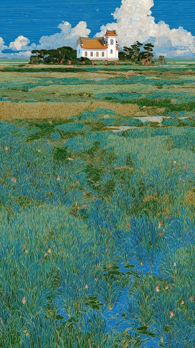 Создано на основе запроса: A green field with a small wooden Anglican church in the distance. Blue sky. Minimal colour palette , Grass swaying under gentle raindrops, warm mist rising from the earth, delicate and evocative, flat design, vector graphics, bright colours, simple lines, high resolution, rich details. A vibrant and lively atmosphere, symbolizing growth, harmony between nature and culture.