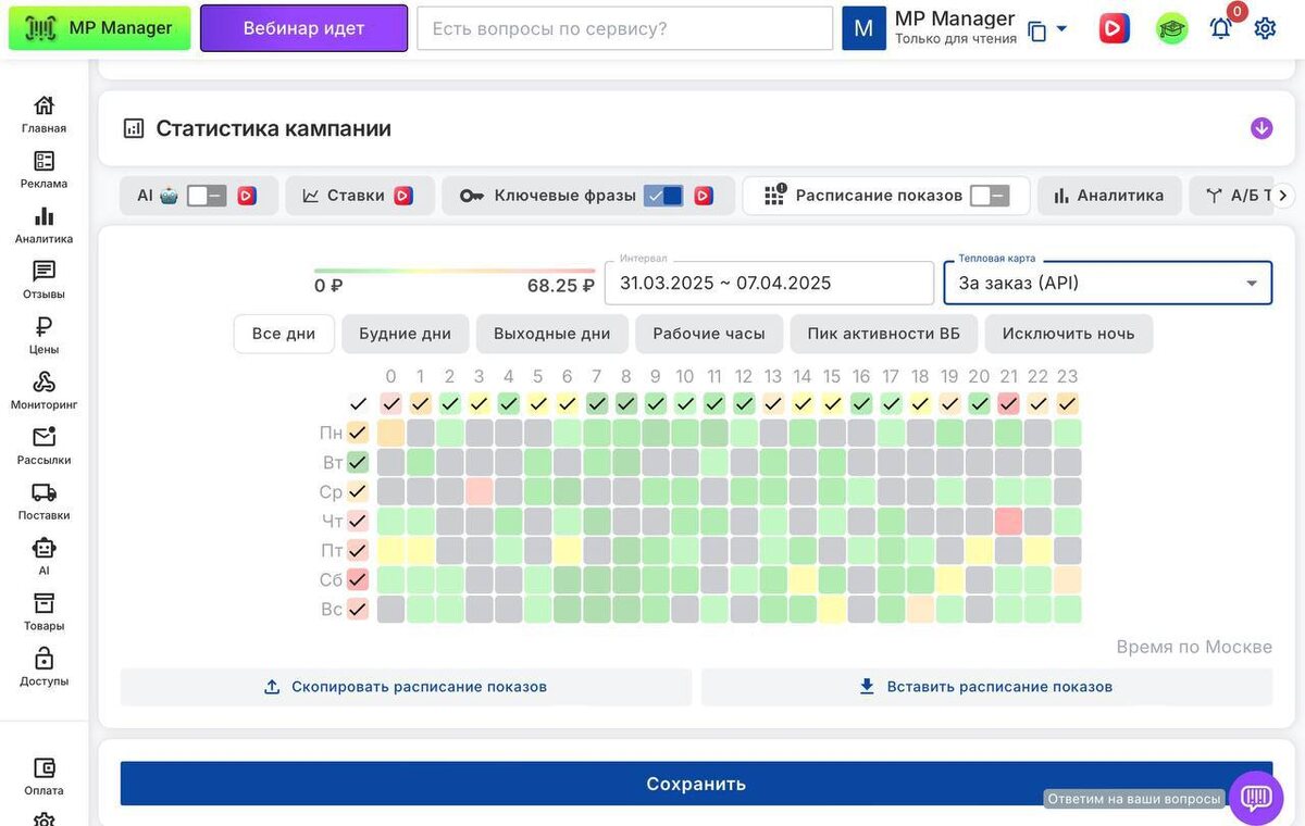 📈 Улучшенная тепловая карта в MP Manager — теперь на основе реальных заказов! Мы добавили новый умный функционал: если у вас включена API Метрика, тепловая карта теперь строится не просто по просмотрам, а по реальным покупкам ваших товаров. Что это значит для вас? ✔️ Карта теперь показывает, в какие дни и часы реально покупают ваши товары ✔️ Можно настроить рекламу точно на те промежутки, когда идут заказы ✔️ Это помогает уменьшить расходы на рекламу и повысить эффективность показов Всё работает автоматически — вам не нужно ничего настраивать вручную. Просто включите API Метрику и смотрите на реальные данные прямо в интерфейсе. 💚 С MP Manager реклама становится умнее — а вы ближе к результату! #Сервис #Обновление