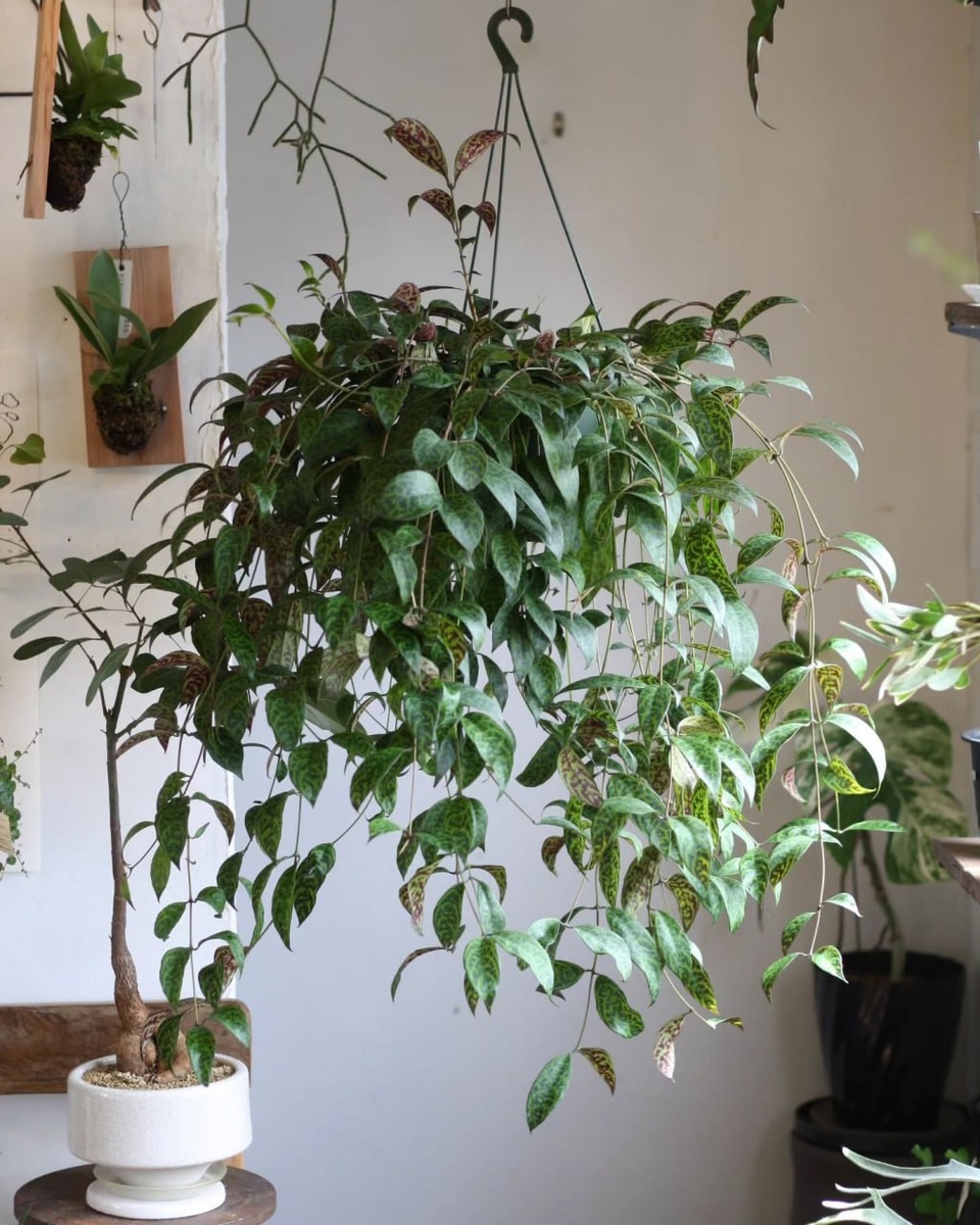 🌿 Эсхинантус мраморный (эсхинантус лонгикаулис, лат. Aeschynanthus longicaulis) - очаровательное ампельное растение родом из Юго-Восточной Азии. В природе произрастает во влажных тропических лесах. Может цвести, однако главная декоративная особенность - глянцевые листья с красивым рисунком. Любит яркий непрямой свет, регулярный умеренный полив, высокую влажность, тепло, а также очень легкие, хорошо дренированные субстраты.