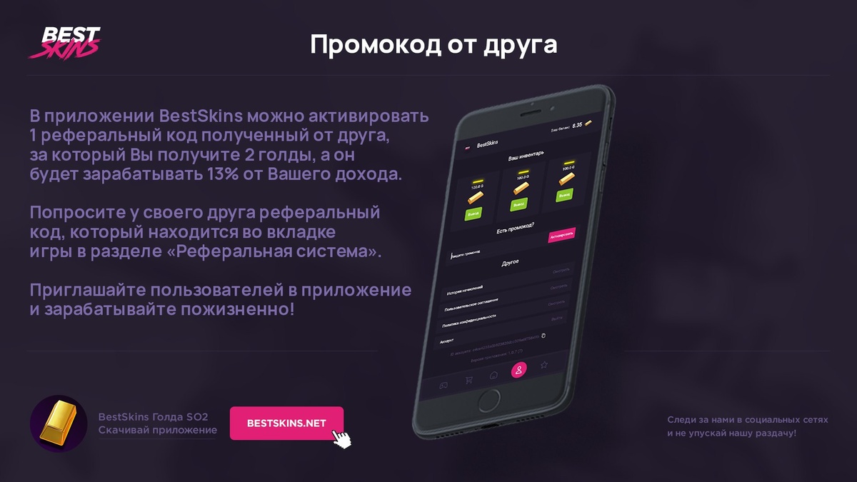 Промокод от друга BestSkins Голда ❤️ Активируй промокод от своего друга в профиле и получи 2 голды на баланс! 😱 А если у тебя нет реф.кода от друга, то вводи наш - BESTSKINS 🤪 🎁 Скачать - https://bestskins.net/