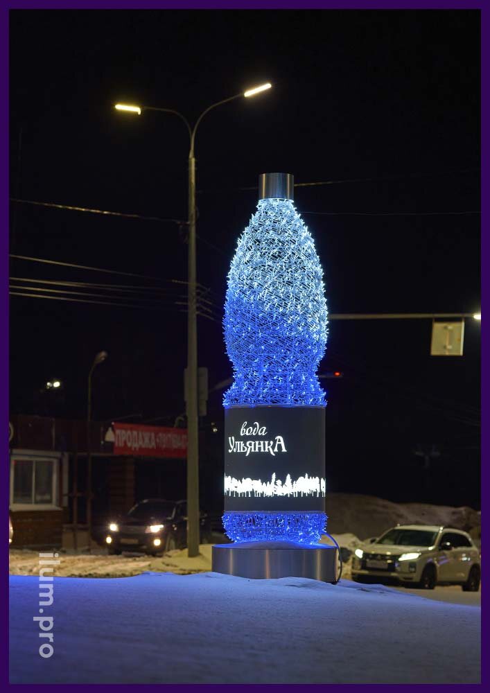 Помимо этого конструкция должна была выделять местный бренд – минеральную воду «Ульянка». Решением стало произвести светодиодная бутылку. Вместо стандартной елки или снежинки разработали 4-метровую светящуюся бутылку: