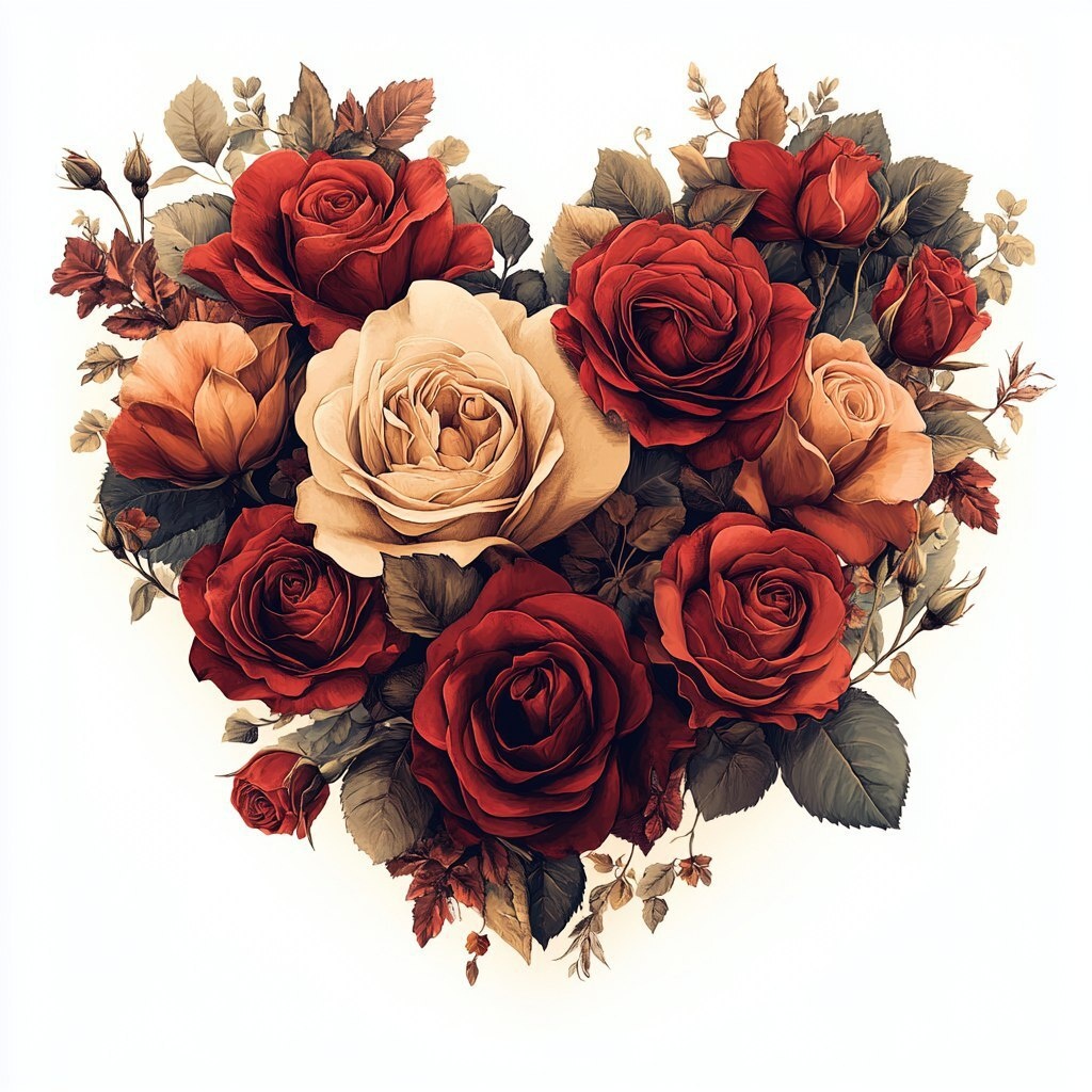 Создано на основе запроса: A heart-shaped arrangement of red roses, digital art in the style of a luminous palette, on a white background