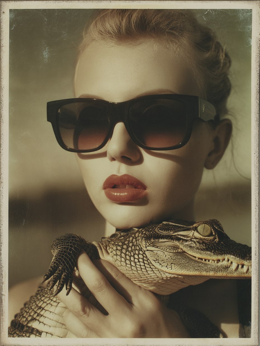 Создано на основе запроса: A Polaroid of a woman wearing oversized sunglasses with large square frames, her head held in the jaws of a small alligator, in the style of 1980s fashion photography, a retro Vogue magazine cover shot with high detail. --- Автоперевод: Поляроид женщины, одетой в негабаритные солнцезащитные очки с большими квадратными рамами, ее голова держалась в челюстях маленького аллигатора, в стиле модной фотографии 1980 -х годов, обложки журнала Retro Vogue с высокими деталями. Как тебе изображение? 🤔 https://dzen.ru/id/65c0c65c86e4f837c27b24d7 #ИИ #AI #нейросеть #midjourney #art