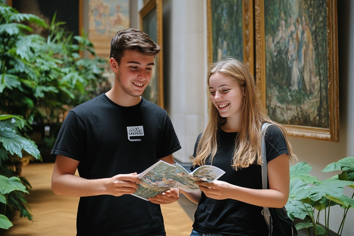 Создано на основе запроса: a young man in black t-shirt with white logo on it stands next to his girlfriend and holds an open brochure between them, they stand inside the British Museum at Gainsborough's painting of Monet's The mint leaf, there is some greenery around them, the girl smiles while reading the projection; --- Автоперевод: Молодой человек в черной футболке с белым логотипом на нем стоит рядом с его девушкой и держит между ними открытая брошюра, они стоят в Британском музее на картине Гейнсборо «Монета Мянчатого листа», вокруг них есть некоторая зелень, девушка улыбается во время чтения проекции; Круто вышло? 🤔 https://dzen.ru/id/65c0c65c86e4f837c27b24d7 #ИИ #AI #нейросеть #midjourney #art
