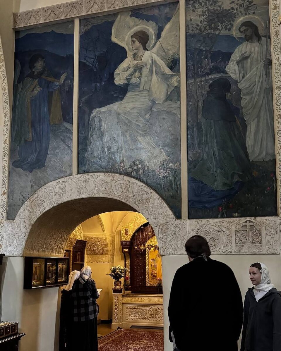 С Благовещением! Великая княгиня Елизавета Федоровна в 1909 году после трагической гибели мужа, Великого князя Сергея Александровича Романова основала Марфо-Мариинскую обитель любви и милосердия на деньги от проданных драгоценностей. Она удалилась от светской жизни в монастырь и решила всецело посвятить себя служению Богу и ближним. А в 1912 был построен Покровский храм в неорусском стиле. Покровский храм Марфо-Мариинской обители создан по проекту архитектора Александра Щусева, который изучил домонгольское русское зодчество и вдохновлялся псковскими и новгородскими храмами. Росписи создавались Михаилом Нестеровым, при поддержке его ученика Павла Корина, который впоследствии служил реставратором в храме. По совету Нестерова Корин поступил в Московское училище ваяния и зодчества и стал известным художником-портретистом. Сам Михаил Нестеров писал: «…теперь можно безошибочно сказать, что это одно из самых художественных созданий церковной архитектуры новейшего времени». Виктор Васне