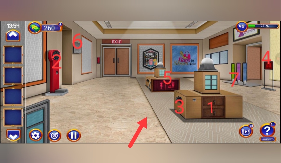 Привет, друзья! Добро пожаловать в зону мобильных игр. ✨ Представляю вашему вниманию новый формат прохождения игры. Постараюсь пошагово объяснить свои действия и довести до завершения уровня (порядок действий в тексте и в видео будут отличаться, так как расскажу с чего лучше начинать, чтобы сэкономить время). Жду ваших реакций на мою инициативу, вызванную новыми реалиями Дзена. И так, приступим. На изображении мы видим торговый зал. В первую очередь жмëм на пол, куда указывает стрелочка (примерное местоположение), и подбираем штырь (все названия предметов буду писать, как в игре, чтобы не путаться). Им открываем ящик, обозначенный цифрой “1”, в котором находим два предмета: масса и монета. Слева видим весы (номер “2”), на которые нужно положить нашу массу, а затем бросить монету в соответствующий разъём. Они покажут вес, который будет паролем для ящика с номером “3”! В этом ящике видим изображение “Сигнал” с одним квадратиком внизу, далее на электронном табло (“4”) находи