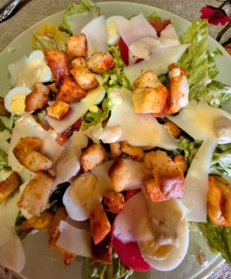 Готовим соус Цезарь: В отдельной мисочке смешиваем майонез, сметану, оливковое масло, соевый соус, рыбный соус, сок лимона, мелко порезанное филе соленой рыбы (анчоус, килька, хамса, в общем-то любая), натертый на мелкой терке чеснок, натертый на мелкой терке желток. Все тщательно перемешиваем. Режем средним кубиком белый хлеб, сбрызгиваем его растительным маслом, обжариваем на сковороде до золотистого цвета. Перепелиные яйца отвариваем до готовности, чистим и режем пополам. Салатные листья промываем под проточной водой, режем порционно ножницами и обсушиваем на бумажных полотенцах. Помидоры режем средним кубиком (если черри, то режем пополам). Креветки чистим, вынимаем кишку, режем вдоль пополам, солим, перчим, добавляем мелко рубленный чеснок и обжариваем с двух сторон до готовности. Салатные листья укладываем на тарелочку, обильно поливаем соусом и перемешиваем. Укладываем сверху креветки, помидорки, перепелиные яйца. Сбрызгиваем бальзамическим соусом, украшаем слайсами из сыра, нат