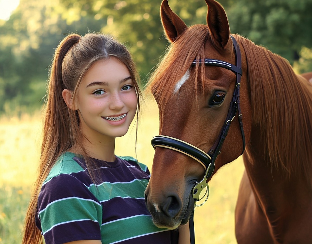 Создано на основе запроса: A high school girl with a ponytail and braces poses next to a brown horse, wearing a striped shirt in green