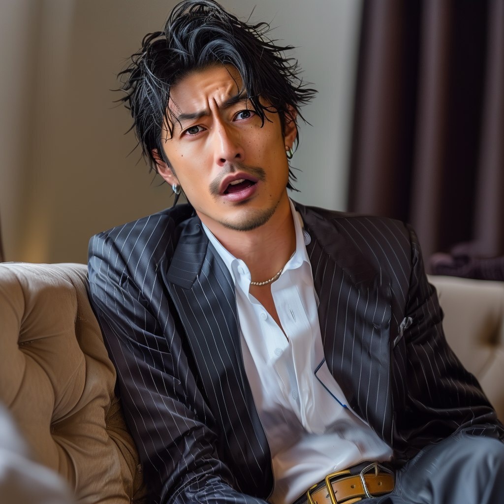 Создано на основе запроса: Wild spiky hair,gold color hair, shiny light navy suit,, belt,sitting on the sofa, opening mouth