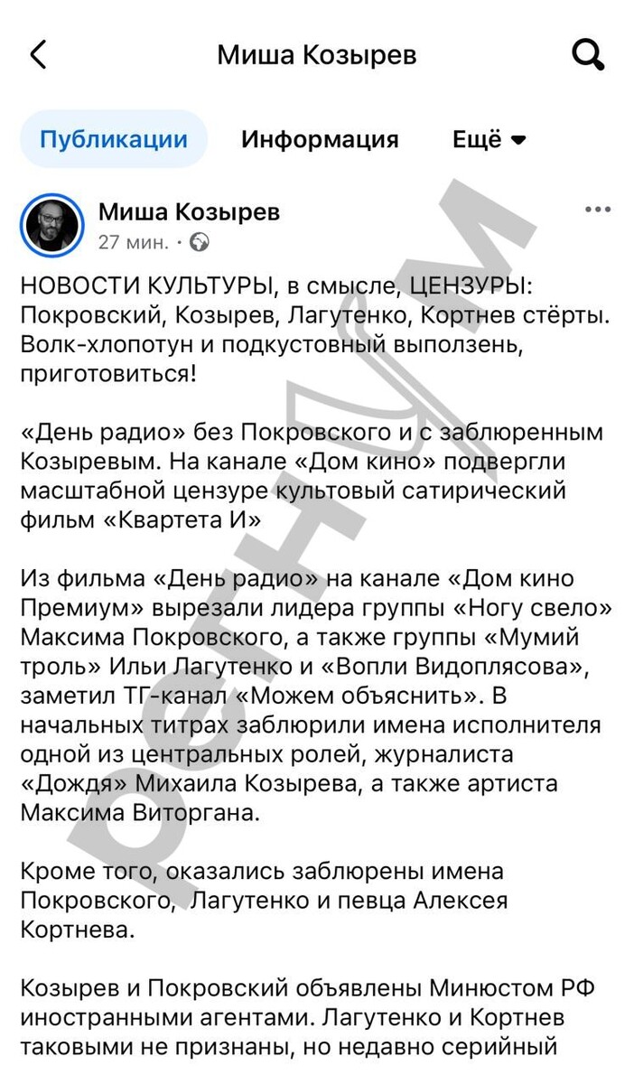 Иноагент Михаил Козырев негодует. На российском тв стали убирать имена аниросскийских перебежчиков из титров российский фильмов. Первым, под суровую ты цензуру попал буквально кишащий иноагентами шедевр "Квартета И" "День радио". Из титров, по версии иноагента Козырева, помимо его собственного имени исчезли имена иноагента Покровского, сбежавшего из страны и отказавшегося выступать перед россиянами Ильи Лагутенко, и пытающихся усидеть на двух стульях Максима Виторгана и Алексея Кортнева. "Персонажи были сохранены, но их присутствие в фильме значительно сократили", - возмутился уже больше трех лет проживающей в "свободной" Европе и сыпящий оттуда проклятиями в сторону покинутой им Родины иноагент Козырев.