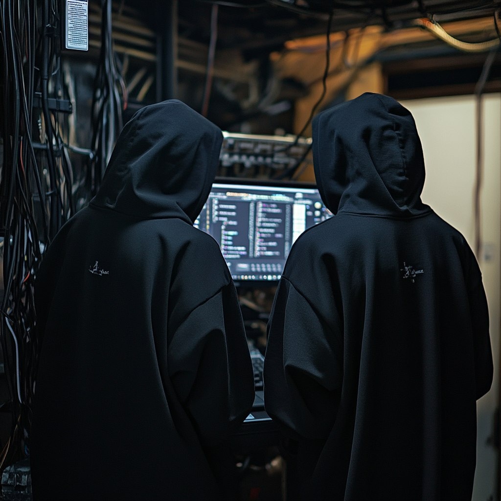 Создано на основе запроса: a hyper realistic award winning photo of 2 hackers in a black hoodie