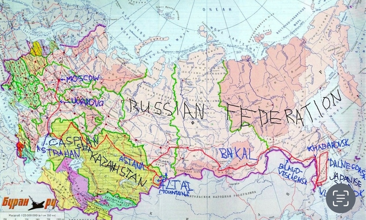 Решили стартовать в середине июля, встречаемся с ним в Тамбовской области, оттуда поедем на юг до Астрахани, там перейдем границу с Казахстаном и далее до Каспийского моря город Атырау далее поедем по маршруту -Актобе-Костанай-Астана-Павлодар-Семей (Семипалатинск)-Рубцовск-Барнаул (обязательно покатаемся по горному алтаю)-Ленинск-Кузнецкий-Кемерово-Красноярск-Иркутск-Улан-Удэ-Чита-Сковородино- Свободный- Благовещенск-Биробиджан-Хабаровск-Владивосток-Дальнегорск ( и все остальное), ну и в обратной последовательности до Москвы только теперь через Россию.