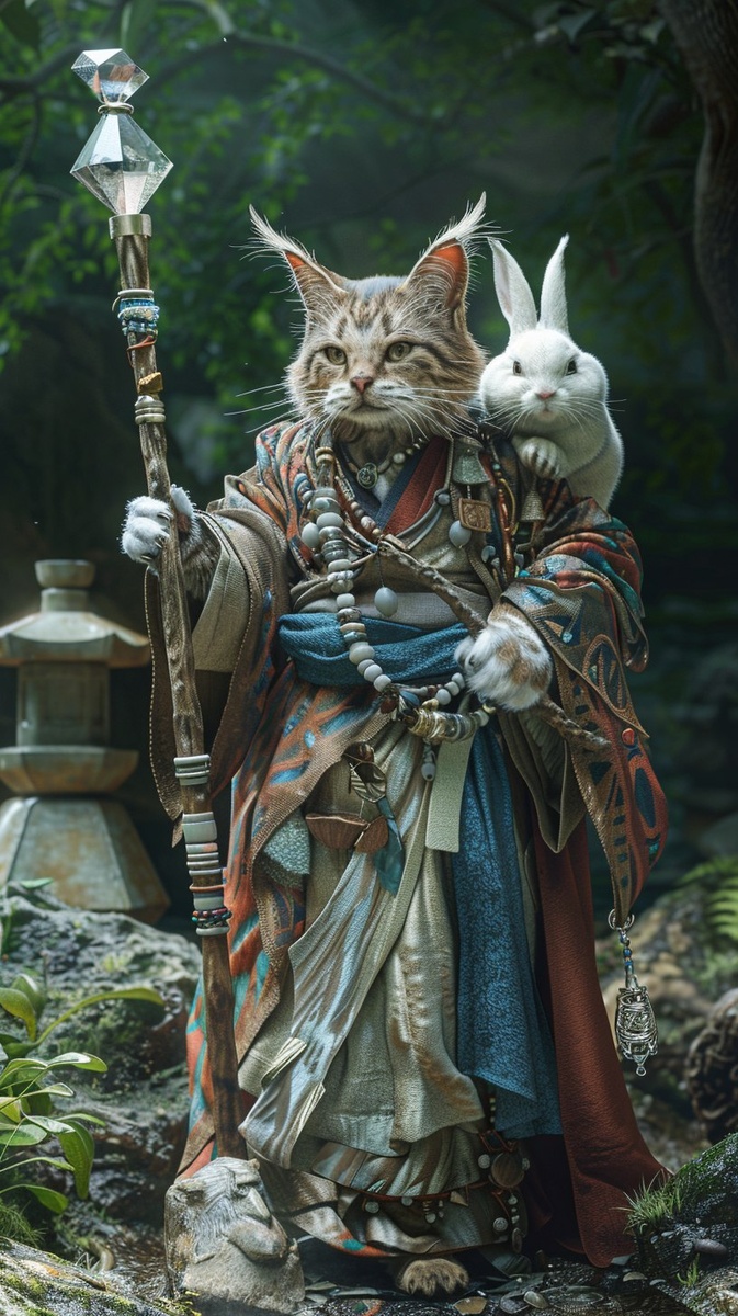 Создано на основе запроса: A gentle photorealistic bipedal cat with a white rabbit on its shoulder, wearing sacred robes and a staff embedded with healing crystals. Fur and fabrics are richly textured. Background: serene spiritual forest near a shrine.