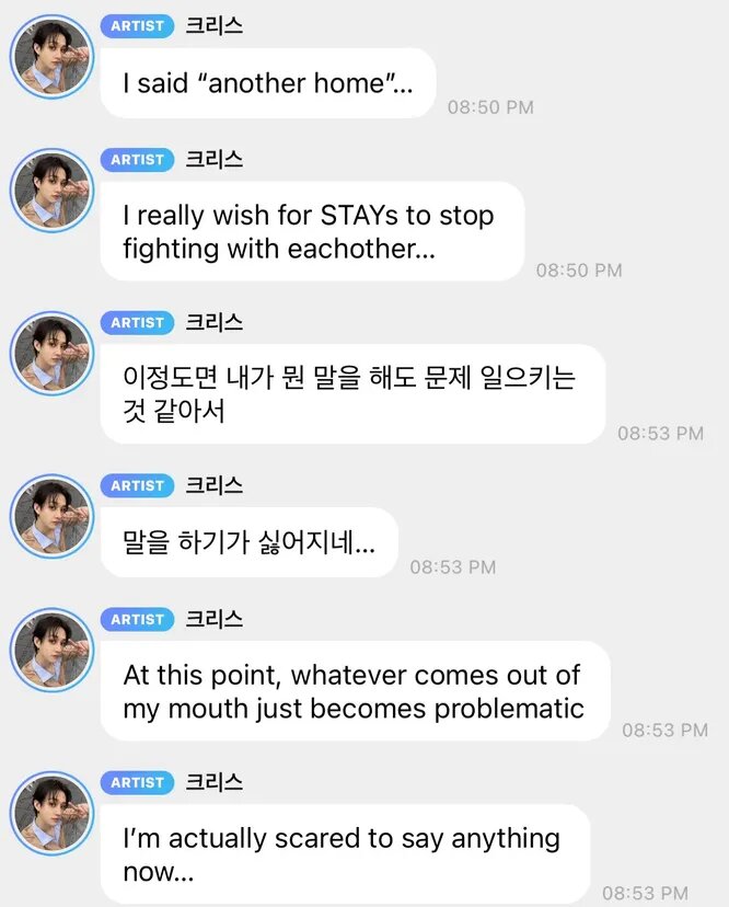 И фанаты накинулись на 27-летнего айдола с критикой и сами перессорились, Крису пришлось извиняться и он сказал в своем Bubble-канале: «Я действительно хочу, чтобы STAY перестали ссориться друг с другом.В какой-то момент все, что я говорю, превращается в проблему. Я боюсь теперь вообще что-либо говорить». И добавил: «Это не ваша вина. Я постараюсь быть лучше. Иногда этого достаточно». Эх, папочка Крис. Не знаю, конечно, в чем твоя вина, я не вижу проблемы в выражении симпатии к стране, которая нравится. ХХ тоже возмущен: