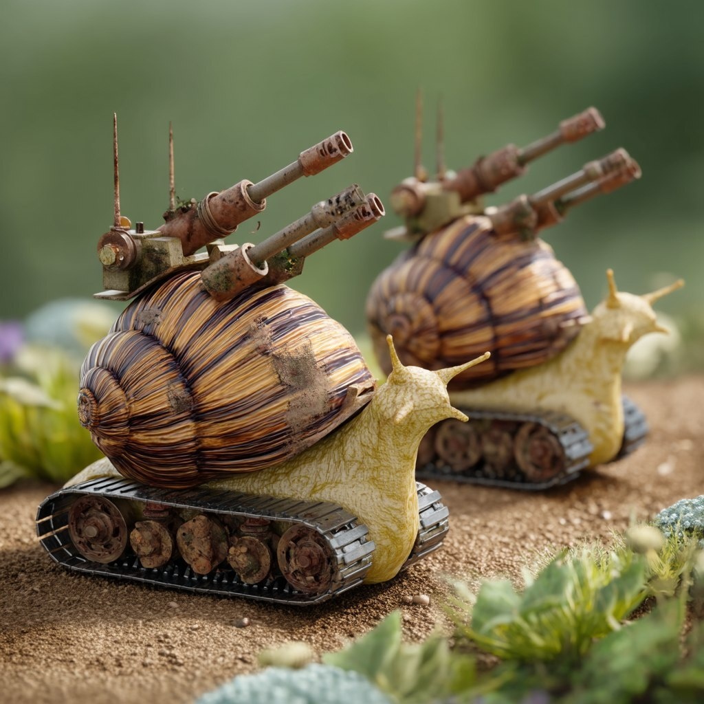 Создано на основе запроса: 2 garden snails with tank treads. large artillery guns mounted to their shells. --- Автоперевод: 2 садовые улитки с танками. Неплохо выглядит? 🤔 https://dzen.ru/id/65c0c65c86e4f837c27b24d7 #ИИ #AI #нейросеть #midjourney #art