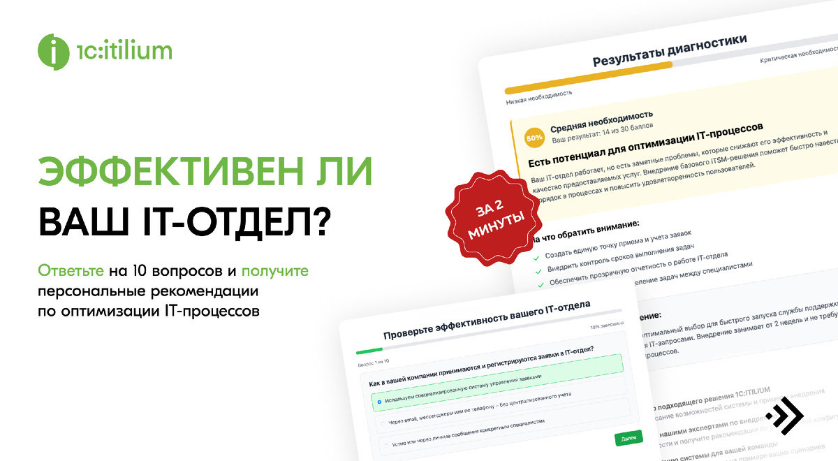 До 25% заявок не доходят до исполнения. Время обработки увеличивается в 2–3 раза. Причина — отсутствие системного подхода и автоматизации сервисных процессов. ✅ Пройдите бесплатный тест на эффективность IT-процессов от экспертов 1C:ITILIUM — всего 2 минуты, и вы получите: — Объективную оценку состояния вашей IT-поддержки;