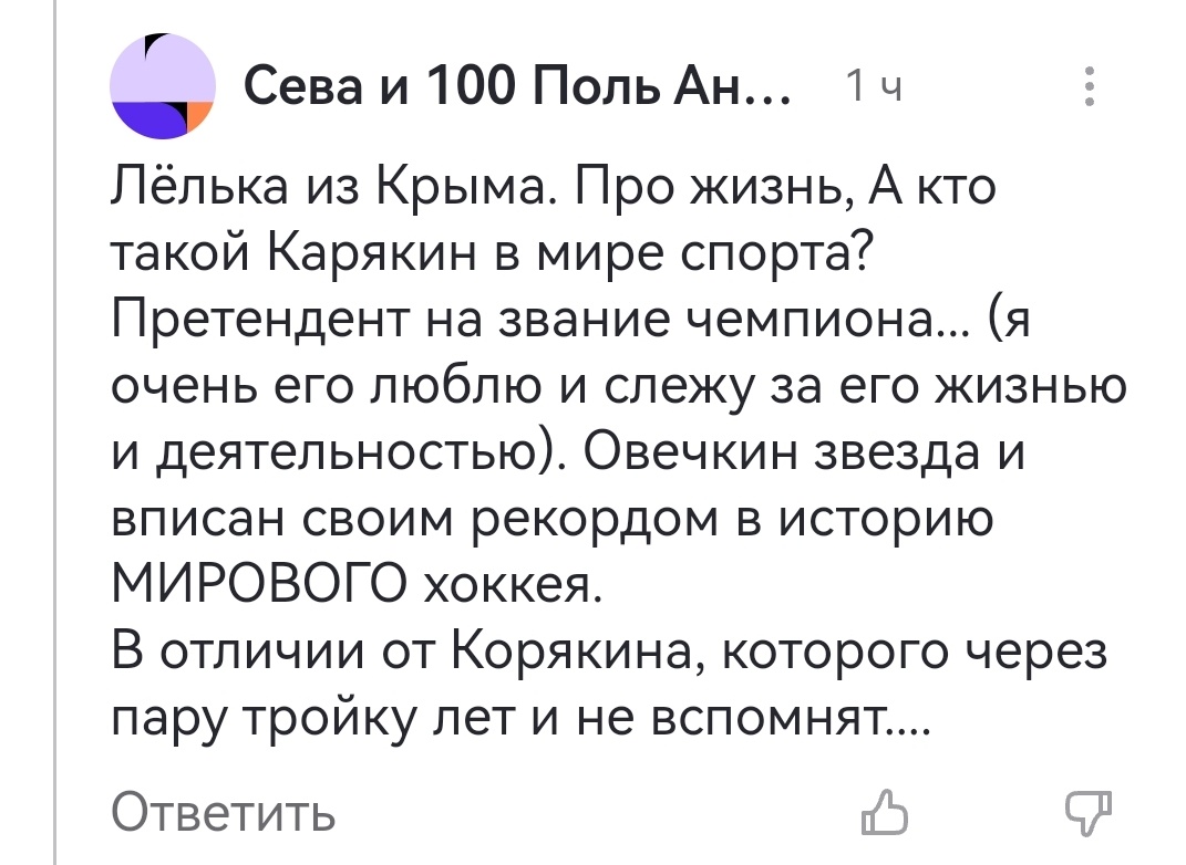 Но больше всего меня поразило другое. Есть люди, которые считают, что Овечкин звезда, а вот Карякин ничего такого не сделал