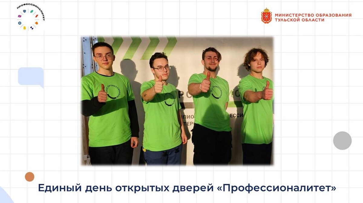 В субботу, 12 апреля, в рамках проекта «Профессионалитет» в колледжах и техникумах Тульской области состоится масштабное мероприятие — Единый день открытых дверей. С 2022 года наш регион активно участвует в этой программе. Сейчас в Тульской области работают восемь кластеров, охватывающих пять ключевых отраслей экономики. В состав кластеров входят 19 организаций среднего профессионального образования и 30 предприятий, что способствует тесному взаимодействию между образованием и производством. По программам «Профессионалитета» обучается около 5 тысяч студентов, что свидетельствует о высоком качестве образования и востребованности рабочих специальностей в нашем регионе. Важно отметить, что с 2025 года программа «Профессионалитет» будет реализовываться в рамках национального проекта «Молодёжь и дети». Школьников и их родителей приглашают посетить Единый день открытых дверей. В этот день все желающие смогут узнать о современных рабочих профессиях, правилах поступления в организации среднего