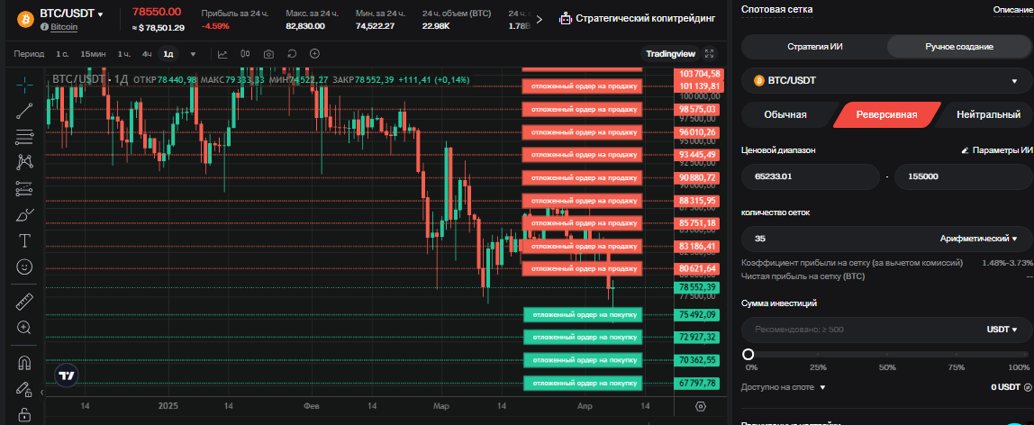 Давай разберем задачу шаг за шагом и посчитаем потенциальный доход от криптобота с указанными параметрами. Мы будем использовать арифметический расчет: текущая цена биткоина на 07.04.2025 ($77,061), ценовой диапазон ($65,233–$155,000), количество сеток (35), коэффициент прибыли на сетку (1.48%–3.73% после вычета комиссий) и начальную инвестицию ($500). 1. Основные параметры - Ценовой диапазон: от $65,233 до $155,000. - Ширина диапазона: $155,000 - $65,233 = $89,767. - Количество сеток: 35. - Шаг сетки: $89,767 / 35 ≈ $2,564.77 (расстояние между уровнями покупки/продажи). - Инвестиция: $500. - Коэффициент прибыли на сетку: от 1.48% до 3.73% (после комиссий). - Текущая цена биткоина: $77,061 (находится в пределах диапазона). Предположим, что бот работает по принципу сеточной стратегии: он покупает на уровнях ниже текущей цены и продает на уровнях выше, зарабатывая на каждом выполненном цикле (покупка + продажа). --- 2. Расчет одной сетки Каждая сетка — это уровень цены, на котором бот л