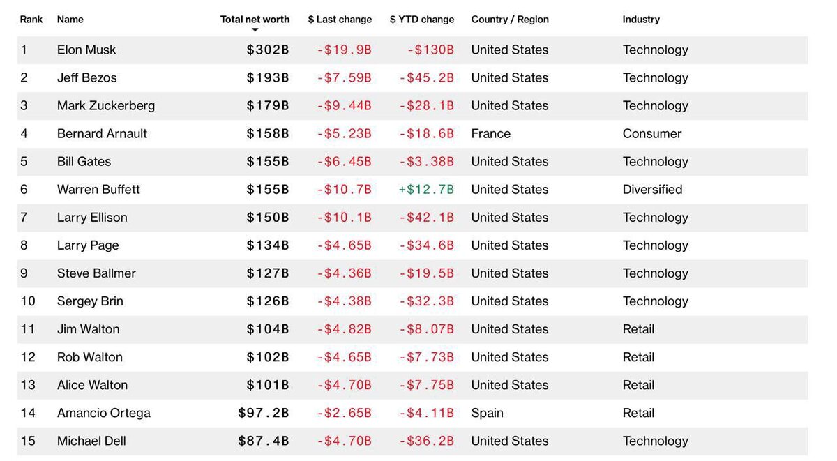 📉 Проверили Bloomberg Billionaires Index. Все миллиардеры из топ-15 в минусе, кроме одного Все самые богатые люди мира в топ-15 — в красной зоне, от Илона Маска до Билла Гейтса. У кого-то за год — минус 19 млрд долларов, у кого-то — минус 42 млрд. Даже потребительский сегмент подкачал. И только один человек в росте — Уоррен Баффетт. Плюс 12,7 млрд долларов YTD. Единственный в списке инвестор в компании бизнесменов и технологических визионеров. Пока одни делают ставку на метавселенные и искусственный интеллект, Баффетт последовательно придерживается своей стратегии: инвестировать в понятные компании, вдолгую, без суеты. Вывод — как всегда: инвестиции работают, особенно когда это не краткосрочная спекуляция, а стратегия на годы — а лучше на десятилетия. 🏦 @wealth_iqs