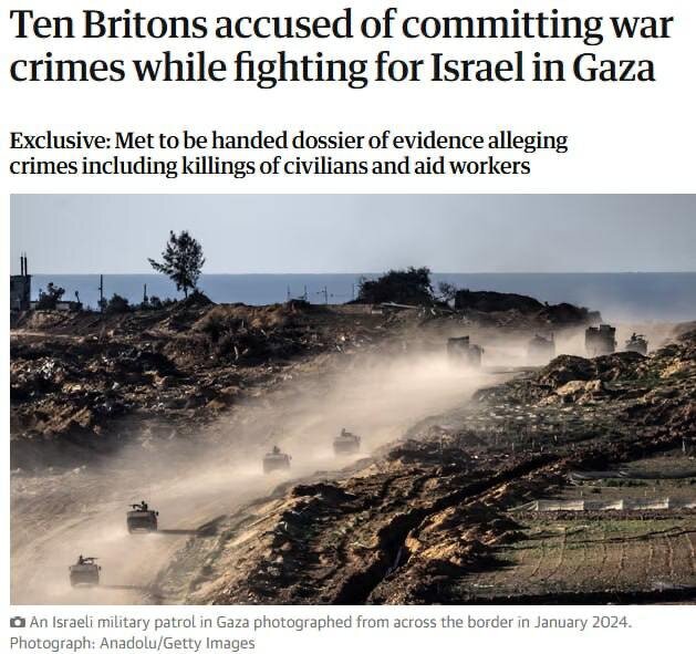 Десять британцев, служивших в израильской армии, обвиняются в военных преступлениях в Газе Десять граждан Великобритании, которые проходили службу в армии Израиля, стали фигурантами громкого уголовного дела. Их обвиняют в совершении жестоких военных преступлений на территории сектора Газа, согласно отчёту Палестинского центра по правам человека. По информации британских СМИ, обвинения касаются целенаправленных убийств мирных жителей и сотрудников гуманитарных организаций. Установлено, что они применяли снайперское оружие против мирного населения, а также осуществляли атаки на гражданские объекты, включая больницы. Имена обвиняемых пока не раскрыты, однако известно, что у некоторых из них имеется двойное гражданство — Великобритании и Израиля. Дело будет расследовано отделом по военным преступлениям Скотленд-Ярда.