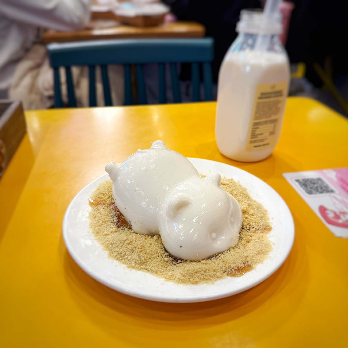 Чико хомяк со вкусом ванили из меню CHICKO по 405 ₽. Меню призывает: «Танцующий пудинг — нежный десерт в форме милых зверушек: котиков, уточек и других персонажей. Они не только тают во рту, но и поднимают настроение своим танцем. Попробуйте популярный тренд из Кореи!» На смену трясущимся муссовым котиками пришли капибары, утки и даже хомяки. По большому счёту, можно сделать любую фигуру, была бы соответствующая силиконовая форма. Что в реальности? Приносят тарелку, на которой лужица густого очень сладкого соуса, посыпанного раскрошенным печеньем. В ней, упитанный хомяк, отчасти похожий на поросёнка, в позе, словно только что прыгнувший в соус. Неплохой мусс и приторный соус. Чтобы не потерять вкус мусса, лучше весь соус не есть. Какая тут оценка? Забавный аттракцион. Этого хомяка можно и ложкой шлёпать, и крошкой посыпать — чем не контент для соцсетей? Я же ограничусь строгим фото.
