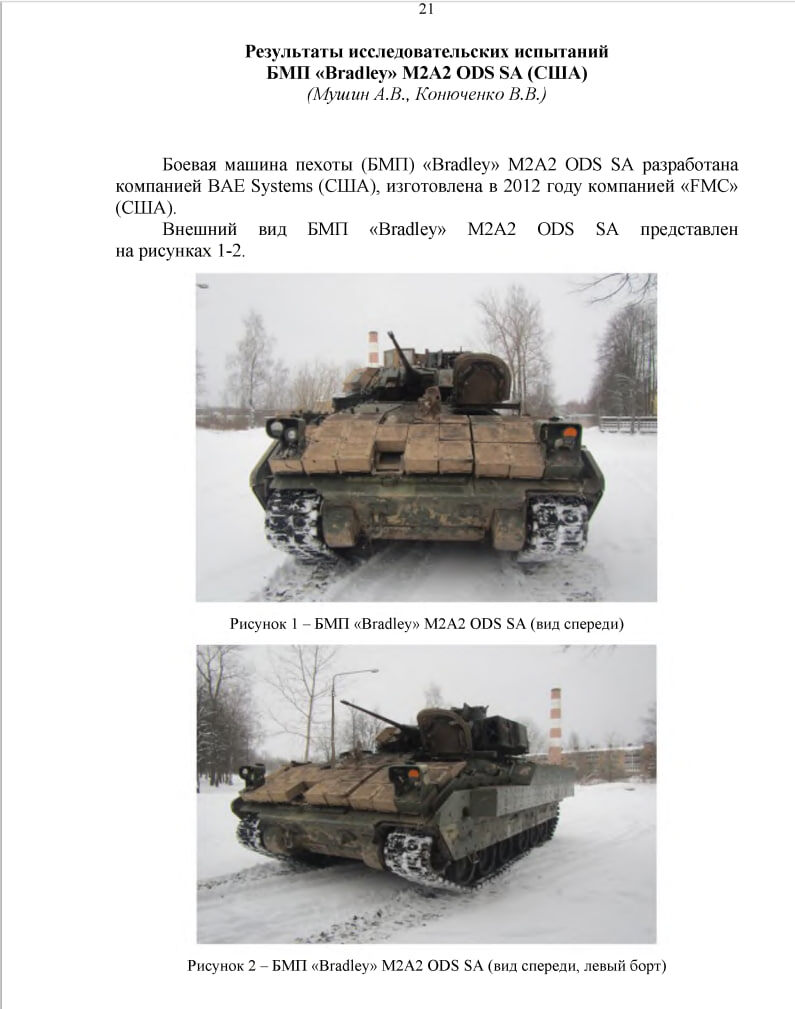 Опубликованные результаты исследовательских испытаний БМП Bradley M2A2 ODS SA от 38-го НИИИ БТ Минобороны по сути говорят о превосходстве американской машины над российской БМП-3 по основным параметрам. Согласно выводам из доклада, БМП М2А2 Bradley ODS SA превосходит БМП-3 по следующим характеристикам: По противоминной защите Bradley превосходит БМП-3 за счет двух листов из алюминия и стали, установленных на днище, смонтированного внутри противоминного полимерного коврика и установленных амортизирующих кресел десанта. Бортовая проекция обеспечивает защиту от 30-мм снаряда выстрела 3УБР6, не обеспечивает защиту от 30-мм снаряда выстрела 3УБР8; Лобовая проекция обеспечивает защиту от 30-мм снаряда выстрела 3УБР8, что выше уровня защиты лобовой проекции БМП-3. Лобовая проекция с блоками ДЗ обеспечивает защиту от кумулятивных гранат типа ПГ-9ВС и ПГ-7ВЛ; Бортовая проекция с блоками ДЗ обеспечивает защиту от кумулятивных гранат типа ПГ-9ВС, не обеспечивает защиту гранаты типа ПГ-7ВЛ