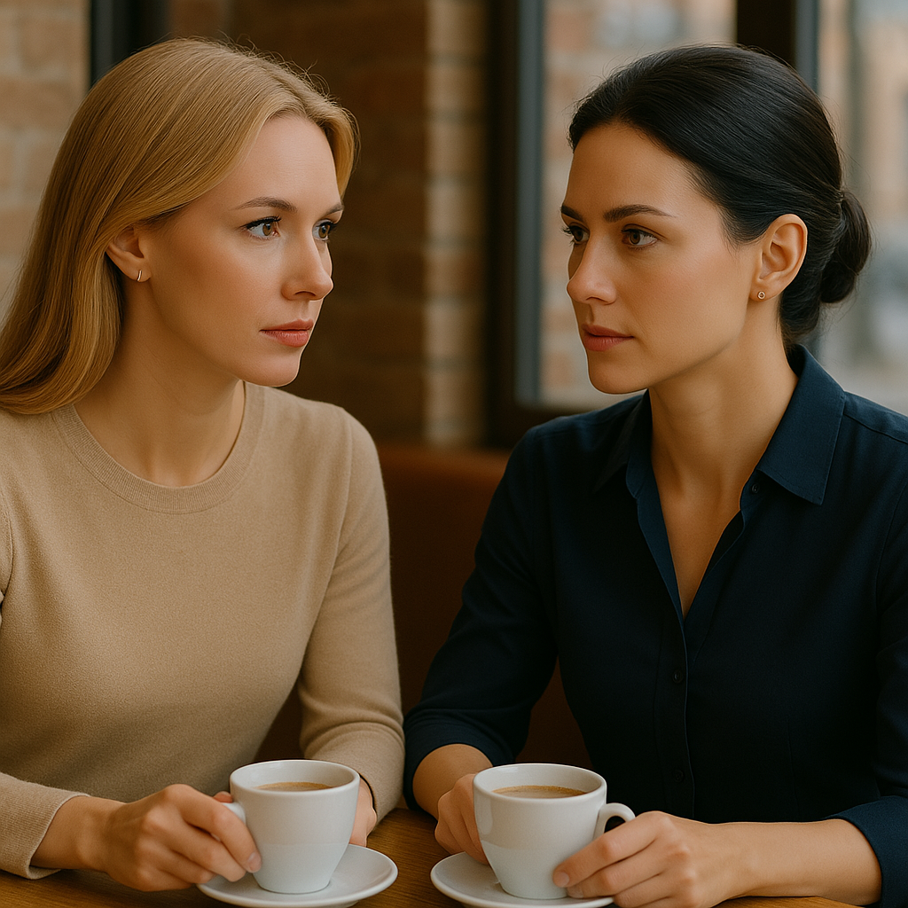 Лена сидела в кафе, аккуратно потряхивая ложечкой чашку с кофе. Погода за окном была пасмурной, дождь стучал по стеклу, создавая лёгкую музыку, которая, казалось, отражала её внутреннее состояние. На улице было темно, но в кафе светло и уютно. Ира сидела напротив неё, ожидая, когда Лена начнёт говорить.