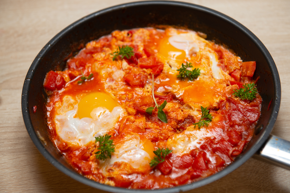 Шакшука с яйцами — классический рецепт: Идеальное блюдо для завтрака или ужина: ароматная томатная основа с нежными яйцами-пашот. Ингредиенты* (на 2–3 порции): - Оливковое масло — 2 ст. л. - Лук репчатый — 1 шт. (мелко нарезать) - Красный болгарский перец — 1 шт. (нарезать кубиками) - Чеснок — 2 зубчика (измельчить) - Тмин молотый — 1 ч. л. - Паприка сладкая — 1 ч. л. - Хлопья чили (или кайенский перец) — щепотка (по желанию) - Консервированные помидоры в собственном соку — 400 г (или свежие, очищенные) - Соль, чёрный перец — по вкусу - Яйца — 4–5 шт. - Зелень (петрушка, кинза) — для подачи - Фета или козий сыр — по желанию. Приготовление: Обжарка овощей: На сковороде разогрейте оливковое масло. Обжарьте лук и болгарский перец на среднем огне 5–7 минут до мягкости. Добавьте чеснок и специи (тмин, паприку, чили), жарьте ещё 1–2 минуты. Томатная основа: Добавьте помидоры, разомните их лопаткой. Тушите на слабом огне 15–20 минут, пока соус не загустеет. Посолите и поперчите. Добавление