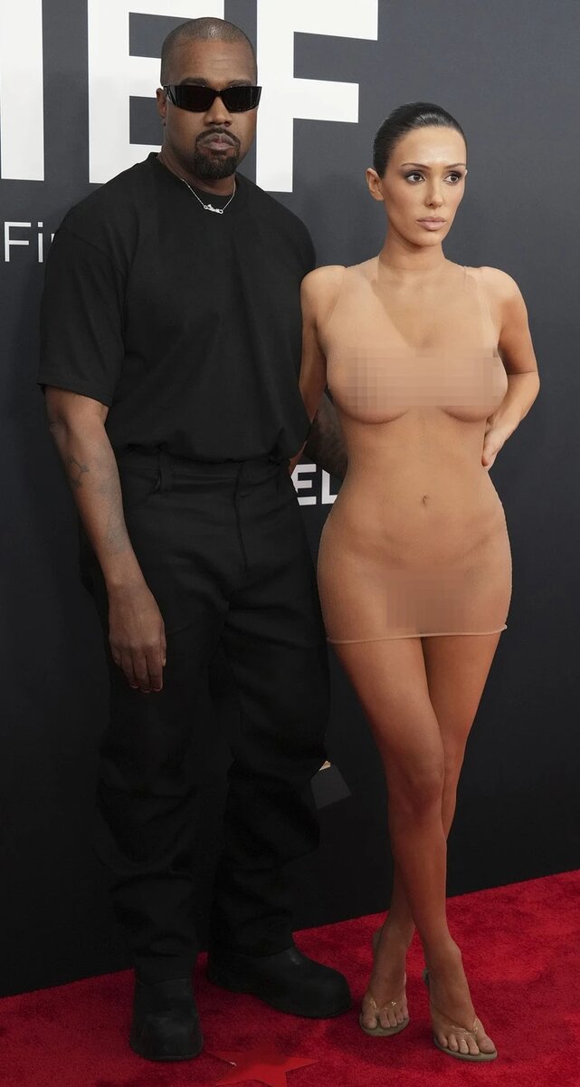 На снимке Канье Уэст и Бьянка Цензори. Места, причинные в скандале, стыдливо заретушированы телесными прямоугольниками...