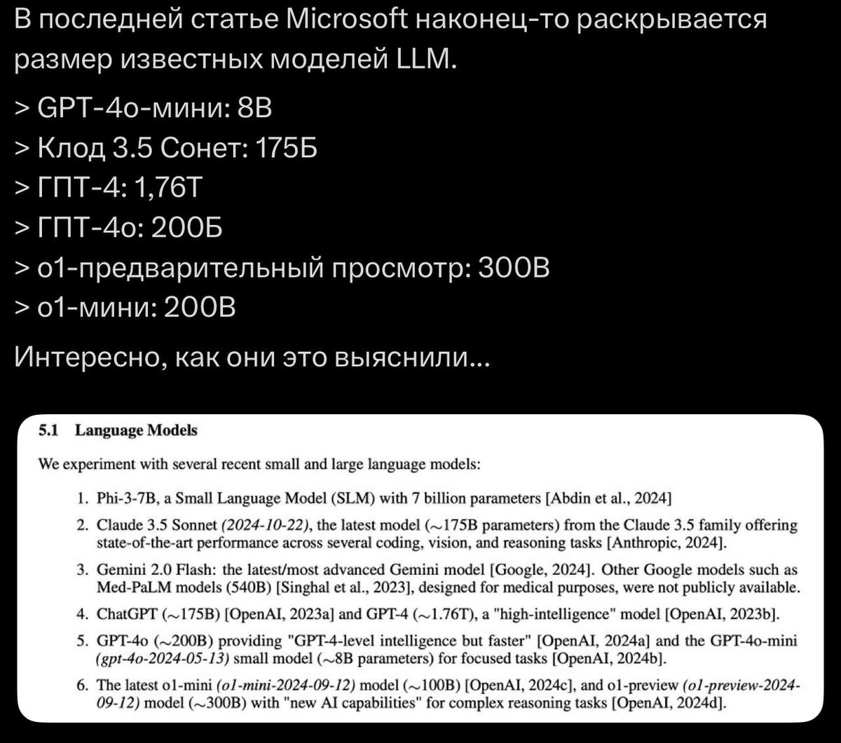 Вот это новость 200b gpt4o? Я готов все деньги мира отдать за то чтобы мне ее открыли, поставлю себе кластер из мак мини Это безумие на самом деле, ощущение что это все не должно быть таким маленьким с учетом качества. 4о мини 8b! Эта модель на момент выхода была лучше любой 32-70b открытой. Да и сегодня останется во многих задачах очень хорошей, банально она на русском разговаривает абсолютно полностью без проблем Безумие