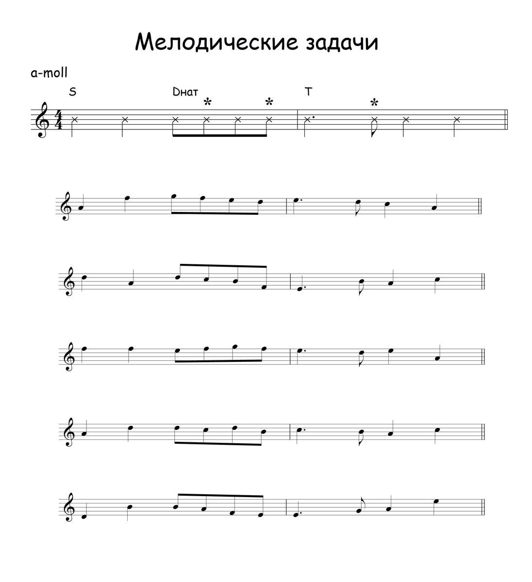 Для освоения темы "функции" и понимания устройства мелодии хорошо подойдут мелодические задачи. Даны ритм и функции, а решить задачу можно по-разному, сложив подходящие по функциям звуки в мелодию. Мелодические (неаккордовые) звуки, отмеченные звёздочками, не обязательно соответствуют указанной функции и заполняют расстояние между аккордовыми звуками. Так, на первую долю первого такта в примере подойдут ступени S тональности a-moll (II, IV, VI, I), на вторую долю – звуки натуральной D (V, VIIнат, II, IV; в принципе возможны любые диатонические ступени, кроме I), на второй такт – звуки тоники (I, III, V). Помимо этих условий, мелодия должна идти естественно и нравиться сочинителю.