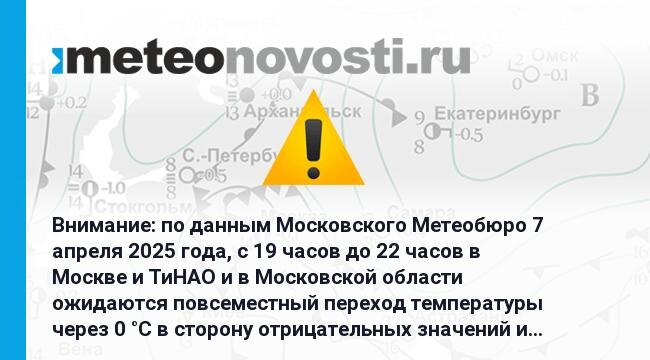 Внимание: по данным Московского Метеобюро 7 апреля 2025 года, с 19 часов до 22 часов в Москве и ТиНАО и в Московской области ожидаются повсеместный переход температуры через 0 °C в сторону отрицательных значений и гололедица. Перейти на сайт Прогноз погоды на 14 дней