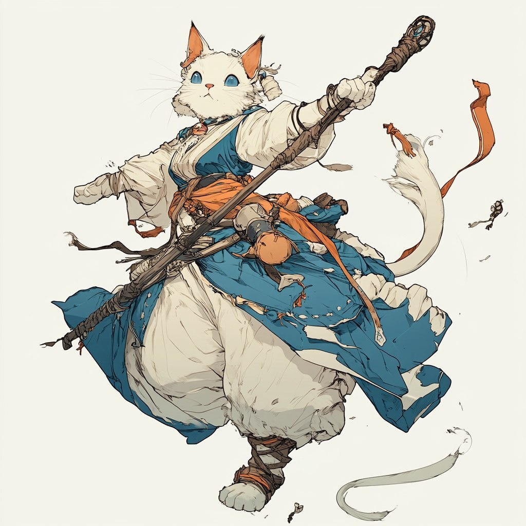 Создано на основе запроса: Fantasy concept illustration, Female Tabaxi Ragdoll white cat medium hair , with thick white tail. Arabian style dresses blue and white colored with Leather armour. Witch with a battle staff in hands. Octopath traveler style, White background, High quality, Exaggerated fighting pose --- Автоперевод: Фэнтезийная концепция иллюстрация, женская табакси рагрольская белая кошка средние волосы, с густым белым хвостом. Интересно вышло? 🤔 https://dzen.ru/id/65c0c65c86e4f837c27b24d7 #ИИ #AI #нейросеть #midjourney #art
