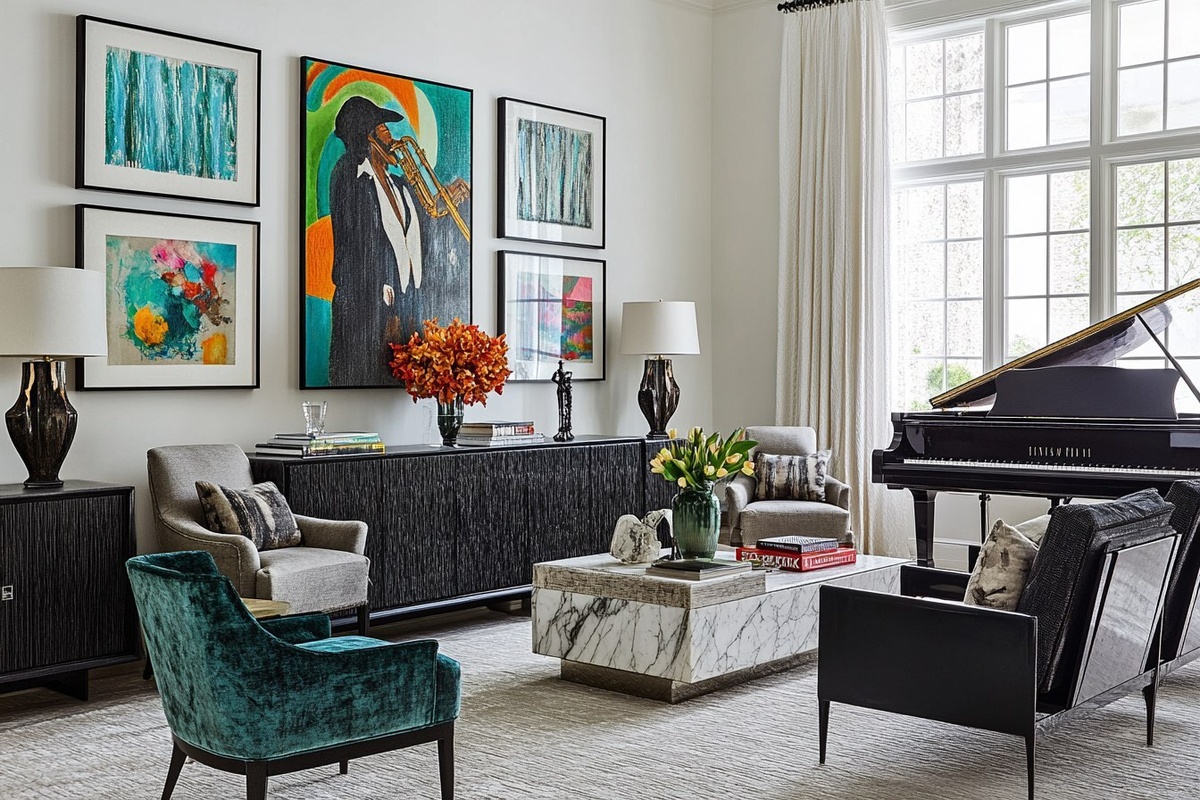 Создано на основе запроса: mid century modern living room, white walls, the wall is only framed paintings of black jazz pianist, black jazz
