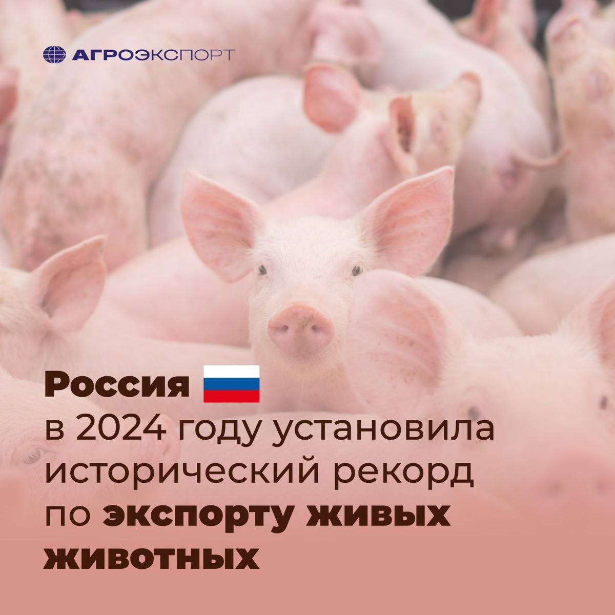Согласно предварительным оценкам экспертов, в 2024 году Россия экспортировала более 83 тыс. тонн живых животных. В сравнении с 2023 годом поставки выросли на 22%. Объем экспорта стал историческим максимумом. К живым животным относятся: свиньи, домашний крупный рогатый скот, лошади, козы, домашняя птица и другие виды животных. В топ-3 стран-импортеров в натуральном выражении по итогам 2024 года вошли: 1-е место — Грузия (34%) 2-е место — Казахстан (21%) 3-е место — Азербайджан (18%)