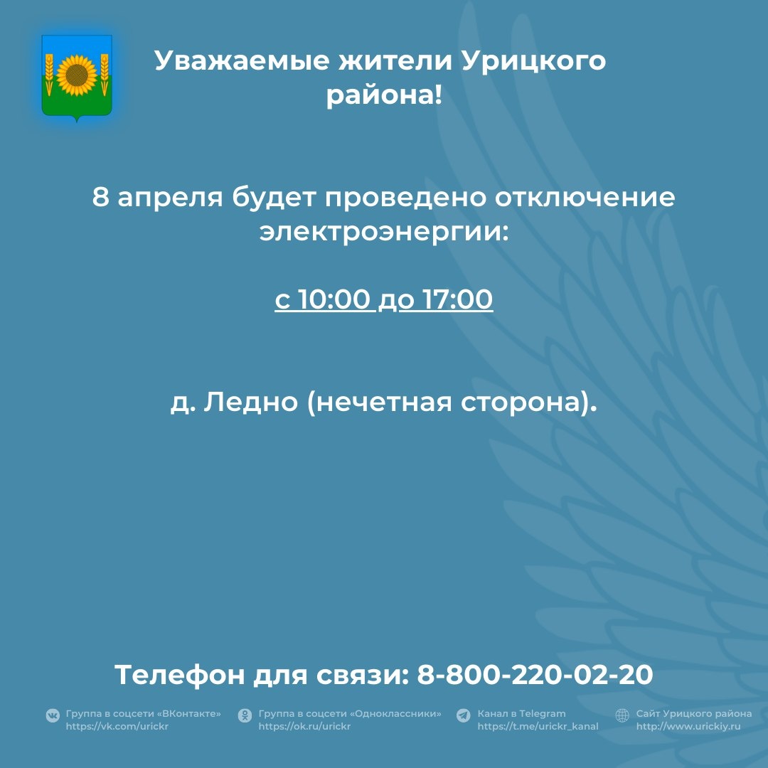 Уважаемые жители Урицкого района! 📢 8 апреля будет проведено плановое отключение электроэнергии. Все подробности в карточке ⬇ #УрицкийРайон #АдминистрацияУрицкогорайонаОрловскойобласти