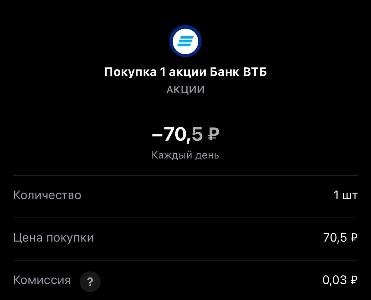 Всем привет! Покупка на сегодня #159, счет пополняем как обычно! Продолжаем копить деньги, обращаю внимание берём один лот! Пока рынок падает, наша задачи накопить денег и купить перспективные бумаги. Статистика портфеля на стороннем сервисе, можно посмотреть по "ссылке" Напомню это челендж с коллегами, каждый рабочий день пополняем брокерский счет на 250 рублей и инвестируем. Если возникли вопросы или есть не понимание, что делать. Задавайте «тут» Покупка #159 🟢 "ВТБ" 70.5 RUB #VTBR 1 лот #каждыйсможет #челенджсколлегами ✈️ Стас Мироненко 📹Youtube | 📹Rutube