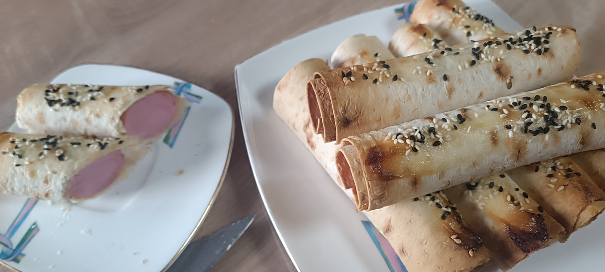 Дочка сказала, что в ее коллекции быстрых рецептов, кроме горячих бутербродов и пельменей нет ничего. Поэтому номер 1 у нас "Сосиска в лаваше". Что может быть проще? Разрезаем лаваш, я чуть смазываю его майонезом, так как нет дома сыра, кладу сосиску (можно половинку) и закручиваю. Далее возможны варианты: можно обмакнуть в яйцо или, как в моем случае, чуть смазала опять же майонезом и посыпала кунжутом. На 12 минут на 200 градусов в духовку до хрустящей корочки и опачки, вкусный перекус готов! Приятного аппетита!