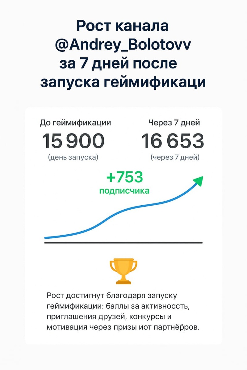 Результат внедрение игровых механизмов в телеграм канал. Как это работает? Подписчики получают баллы за: 🔹 Комментарии и реакции 💬 🔹 Приглашение друзей 🤝 🔹 Бусты канала 🚀 🔹 Участие в конкурсах и акциях 🎁 💡 Это мотивирует аудиторию взаимодействовать с контентом, увеличивает органический рост и снижает зависимость от рекламы. Вот моя ссылка, где можете увидеть механику работы геймификации https://t.me/andreybolotovgame_bot?start=50db72fd168de2cd1dd5 Такое же решение можем внедрить в любой канал, сдаем в аренду готовых ботов, которые будут вести учет и фиксировать активность.