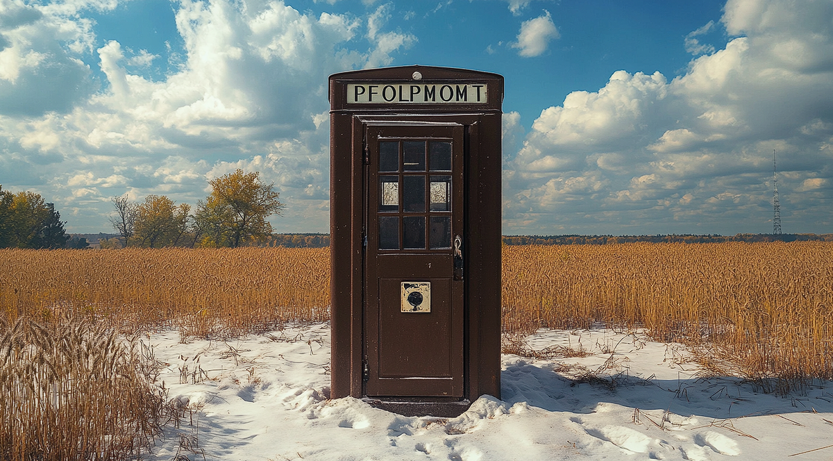 В золотом свете заходящего солнца телефонная будка выглядела как нечто из другой эпохи. Собственно, так оно и было. Андрей остановился поодаль, разглядывая странный объект, стоящий посреди поля за деревней. Старый советский телефонный аппарат, массивный и красный, казался нелепым посреди высоких трав и полевых цветов, словно кто-то забыл его здесь много лет назад. Его удивила надпись. Буквы явно были перемешаны. А ещё снег рядом с будкой. Выглядело всё это очень странно.