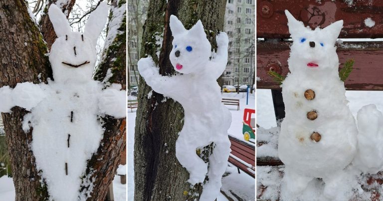 Синоптик Роман Вильфанд сегодня говорил, что при таком количестве снега в Москве уже 9–10 апреля можно будет кататься на лыжах. Снег, по прогнозам, пролежит еще несколько дней, а потепление и весенняя температура наступят только на следующей неделе. Впрочем, оптимисты пользуются моментом и лепят снеговиков. Сейчас снег идеален для лепки, но иногда снежные персонажи получаются немного странными. Канал «Москва 24» опубликовал подборку весенних снеговиков, некоторые из них свидетельствуют о продолжающемся сезонном обострении. Вот, например, распластавшийся по дереву кот с глазами, как у белых ходоков, и высунутым языком. Еще один синеглазый зверь (судя по пышному хвосту, это лис), у которого вместо передних лап крошечные еловые огрызки, разместился на лавке. И по выражению его лица можно сказать, что он тоже удивлен появиться на свет в апреле. Ну а кто-то слепил меж стволов дерева приплюснутого во всех смыслах зайца. Чаще всего, правда, встречаются мини-снеговики, которых делают из малень