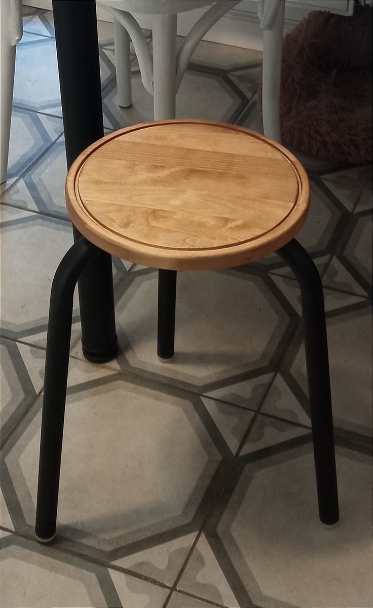 Жили-были табуретки. Одна была совсем старой, её сделали ещё в прошлом столетии, во времена СССР. Вторая же была поновей, но обе они, по мнению людей, у которых они служили верой и правдой, отжили свой век и пришла их пора быть выброшенными в мусорной контейнер. Однако табуреточный бог решил иначе и послал им спасителя. Дело было так. Соседи решили обновить свою мебель и уже заносили стулья в лифт, и тут мы увидели их и решили, что нам они очень нужны! Забрали табуретки себе и решили переделать, потому что очень понравилась форма и материал из которого они были сделаны. Первая была на невероятно устойчивом основании. Три железные ножки, сварная конструкция, металл двойка. Пошёл процесс создания совсем нового предмета мебели. Поменялось всё, от цвета металлического основания, до формы сиденья. В строительном магазине был куплен баллончик с черной матовой аэрозолью по металлу. Долго принималось решение о форме сиденья. Оригинальное было утрачено. Скорее всего оно было треугольным. Трат