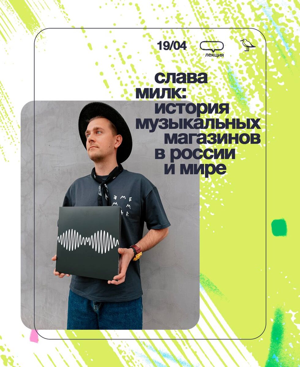 Виниловый Маркет 12in 2️⃣ Слава был первым гостем, которого мы пригласили прочитать лекцию в рамках нашего проекта и спустя почти ровно год, Слава вновь приедет на остров Новая Голландия с лекцией на наш большой Виниловый Маркет, который пройдёт 19 и 20 апреля! 🗓Суббота/19 Апреля 👨🏫1️⃣ Слава Милк Тема: “История музыкальных магазинов в РФ и мире. Самые большие и странные места для покупки винила” "Первые музыкальные магазины появились в первой половине девятнадцатого века, а первые пластинки появились лишь спустя 50 лет. ЧТо же продавалось в первых музыкальных магазинах «Старого света»? Каким образом пластинки для патефонов и граммофонов появлялись в Российской империи, кто занимался их продажей и как строились маркетинговые компании по завоеванию новых экономических рынков? Где приобретали музыку советские инженеры и за пластинки каких исполнителей можно было схлопотать 15 суток? Как музыкальные магазины по всему миру пережили смерть виниловой пластинки и как получилось, что ви